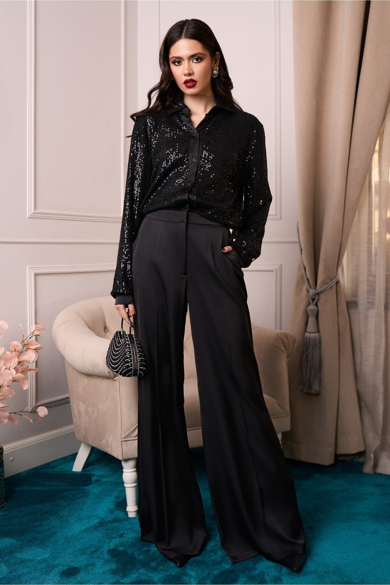 Pantaloni DY Fashion eleganti din satin negri cu croi evazat