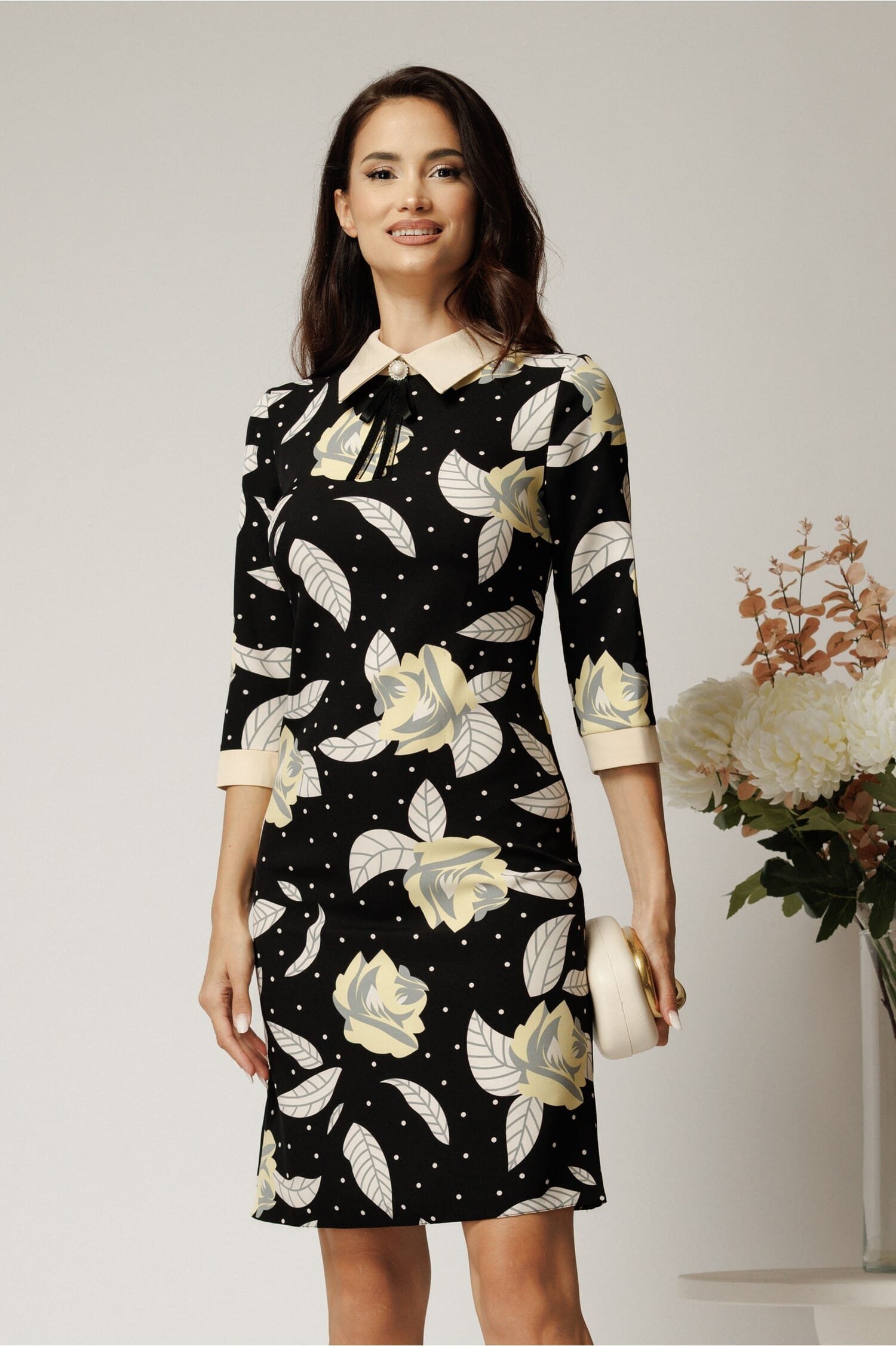 Rochie office cu guler si mansete. Are guler ascutit, maneci trei sferturi si croi cambrat. Rochie office Guler ascutit Maneci trei sferturi Croi cambrat Fara captuseala Inchidere cu fermoar Material:Stofa Compozitie: 96% Poliester, 4% Spandex Fotomodelul poartă mărimea: S | Înălțime: 174 cm Fiecare produs este măsurat individual. Te rugăm să consulți ghidul de mărimi pentru alegerea corectă a mărimii!