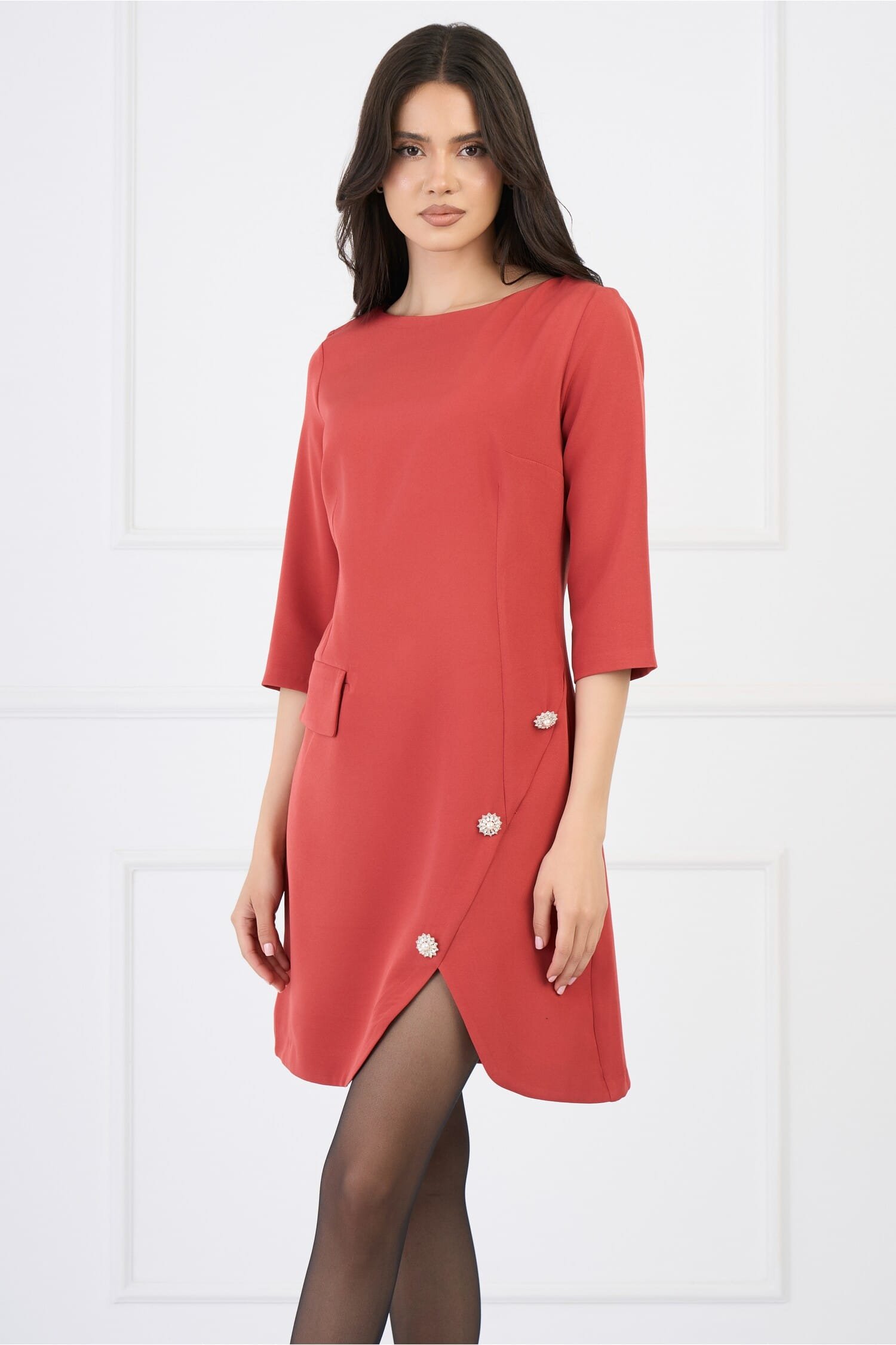 Rochie office scurta din stofa accesorizata cu nasturi decorativi pe fusta. Are decolteu rotund, maneci trei sferturi si croi cambrat. Rochie scurta Decolteu rotund Maneci trei sferturi Croi cambrat Crepeu pe fusta Fara captuseala Se inchide cu fermoar la spate Material: Stofa Compozitie: 95% Poliester, 5% Elastan *Va rugam verificati eticheta produsului inainte de curatare! *Va rugam sa retineti ca o usoara discrepanta de culoare ar trebui sa fie acceptabila datorita luminii si luminozitatii ecranului. *Va rugam verificati ghidul de marimi, in cm, pentru a alege corect marimea.