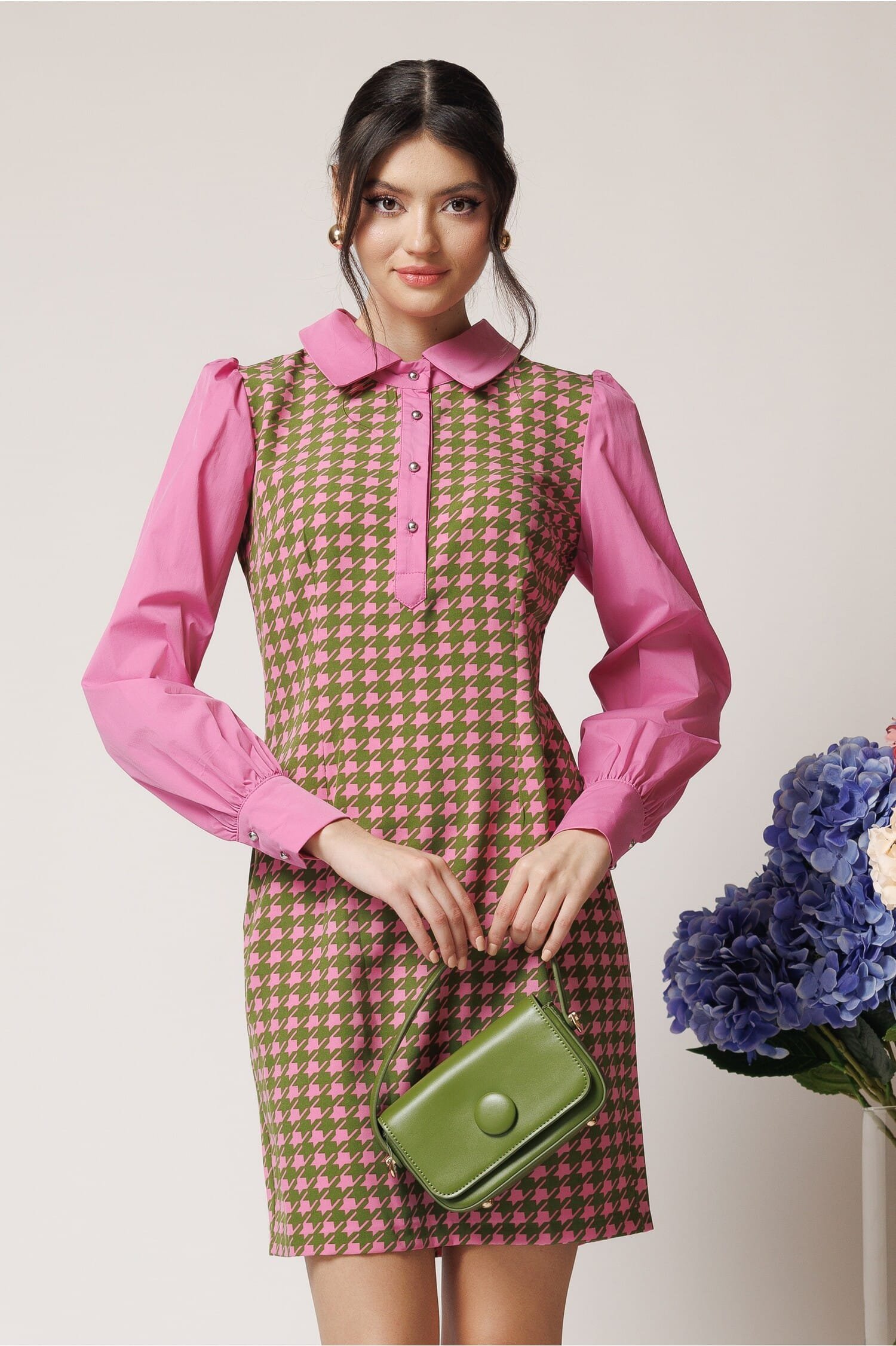 Rochie office cu imprimeu si nasturi la bust. Are guler ascutit, maneci lungi si croi cambrat pe talie. Rochie office Guler ascutit Nasturi la bust Maneci lungi Croi cambrat pe talie Fara captuseala Se inchide cu fermoar la spate Material:Stofa Compozitie: 95% Poliester, 5% Elastan *Modelul are inaltimea de 170 cm. *Va rugam verificati ghidul de marimi, in cm, pentru a alege corect marimea.